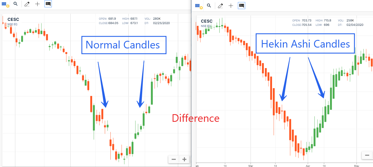 There are many differences between normal candles and Heikin Ashi.