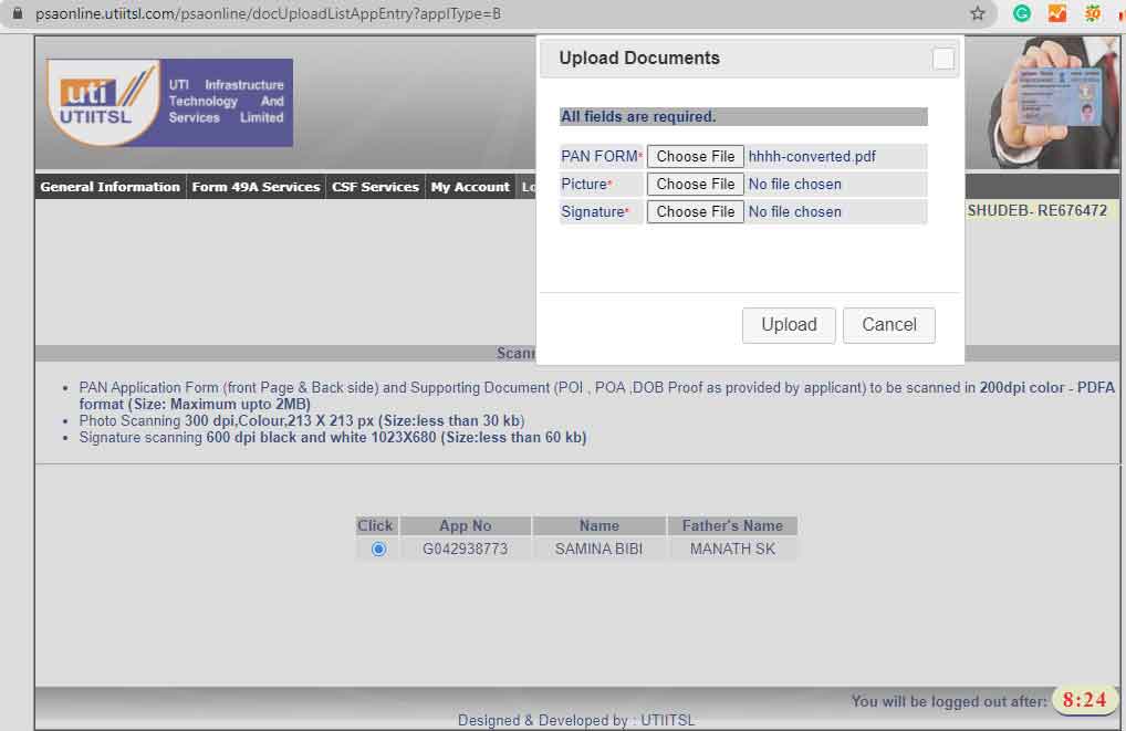 Now again go to Form 49A Services And click on Upload Documents Now here you have to upload a PDF file, Image & signature. And Submit.