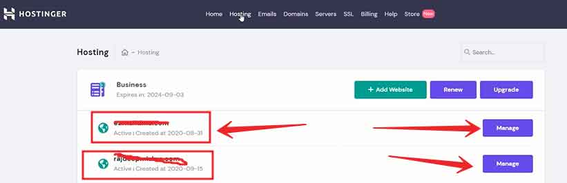 फिर अपने Hosting पर जाएं, वहां आपका Domain दिखाया जाएगा, आपको डोमेन का चयन करना होगा और मैनेज पर क्लिक करना होगा।