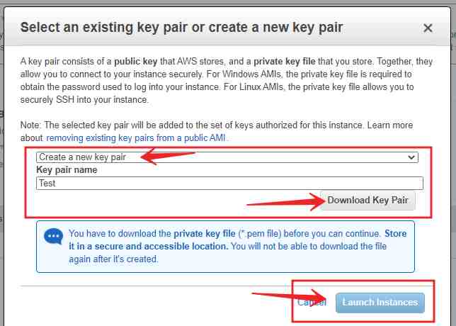 नीचे आपको Key Pair Name देना होगा जिसे आप कोई भी नाम दे सकते हैं। फिर Download key Pair बटन पर क्लिक करें। आपकी key File डाउनलोड हो जाएगी।