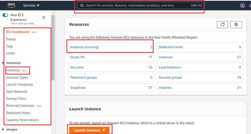 ऊपर दिए गए Search बटन पर जाएं और EC2 टाइप करें।