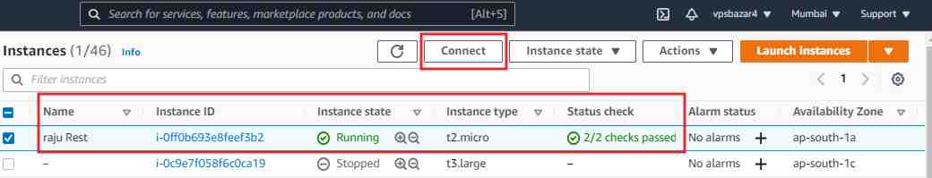 शीर्ष पर launch Instance के आगे Connect बटन पर क्लिक करें।