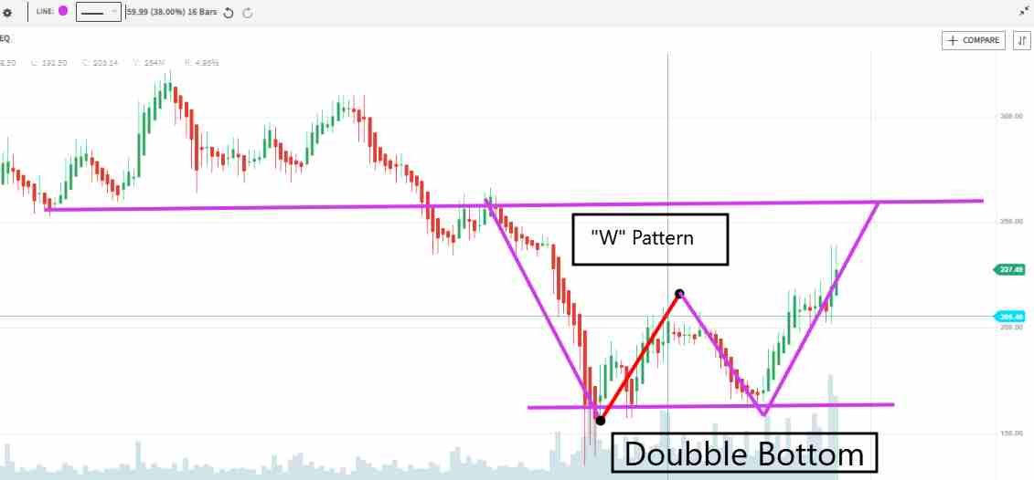 This means ITC shares have firmly established themselves in that space. And if you show the timeframe technical chart for one month, you can see that ITC has made “W” PATTERN around 160-165. And made a DOUBLE BOTTOM PATTERN to 130.