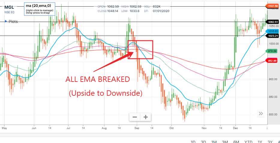 Above I have mentioned 4 MEA, 200 Day EMA is the strongest EMA from other EMA. Any stock cannot easily break 200 Day EMA.