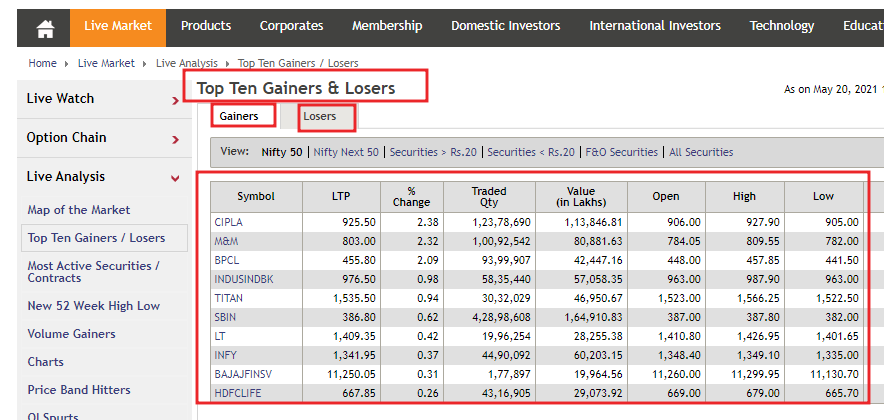 Now check those stocks on the technical chart & Find Break out stock from top gainers. And Find Breakdown stocks from top losers.
